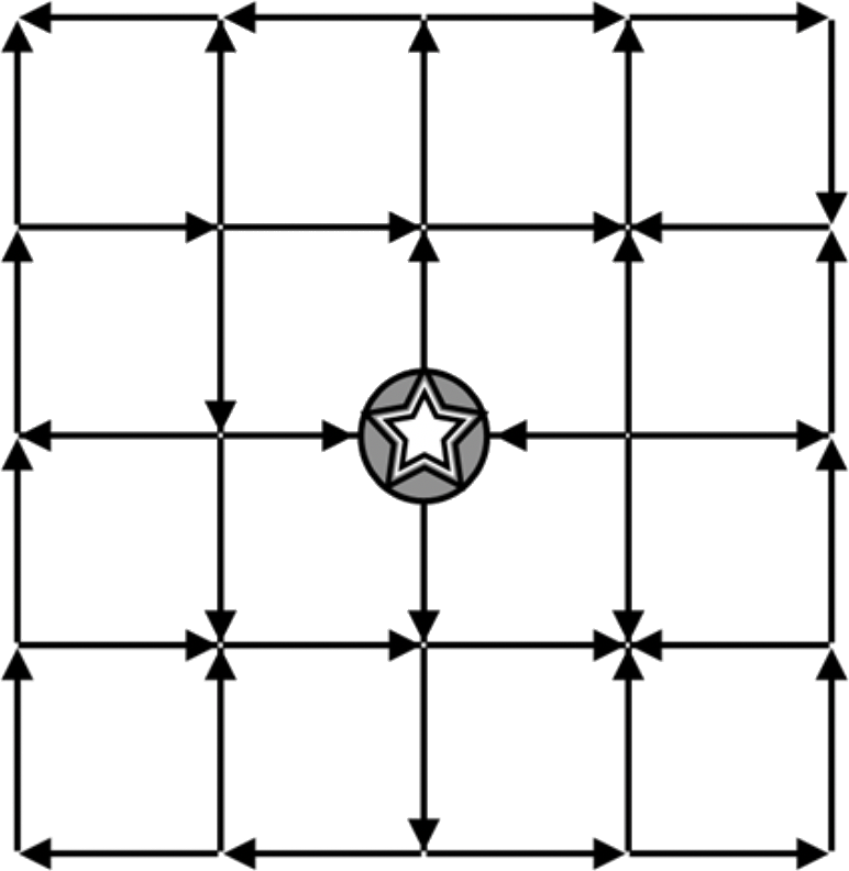 Find the path that leads from the star in the center back to the star in the center. Paths can only go in the direction of an arrow.