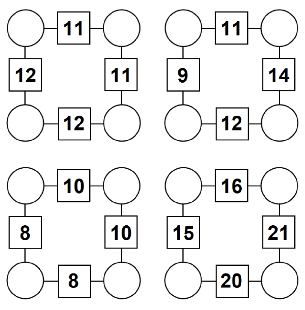 Arithmagon. Find which numbers go in the empty circles. The numbers in the square boxes are made by adding together the numbers in the circles either side.